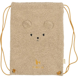 The string bag is a small, lightweight bag that is adjustable with two strings and a beautifully embroidered bear face in front.