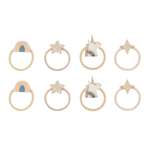 3cm stretchy and strong elastics in pale pinks and neutrals adorned with unicorns, rainbows and stars crafted from a pretty mix of soft velvet, glitter and metallic fabrics