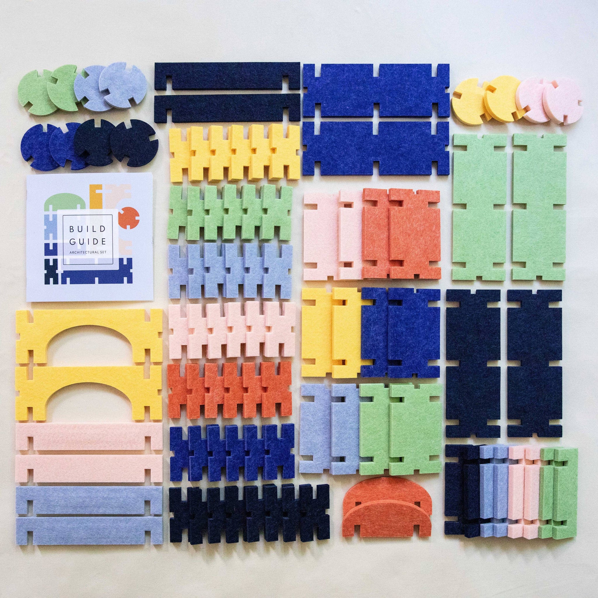 Contains 92 assorted interlocking felt blocks: 6 large blocks 6 large half-blocks 2 large arches 12 medium blocks 8 medium half blocks 2 domed blocks 44 small blocks 12 round joiners Deceptively simple; our straightforward toys foster creativity and invention.