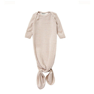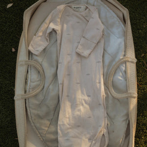 The softest baby gown made out of our organic cotton rib. Rib binding & lap opening at neckline. Binding at the leg opening that ties at bottom. Cuffs can fold over little hands too to keep them from scratching their face.