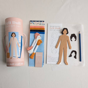Felt Doll Craft Kit is a fun introduction to fashion design and pattern making! A fashion-forward take on a vintage paper doll craft; each Design Set includes complete instructions, a pre-cut felt doll, choose-your-own hairstyle (3), clothing patterns, drafting material, chalk pencil, felt fabric swatches (9), and embroidery floss + needles. A certain hit with budding fashionistas, this set does require tracing and cutting skills and is intended for ages 6-10 years.