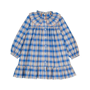 Shirt dress in check embroidered with small flowers. Wide, flounced collar with smocking and front button placket closure. Balloon sleeves with elastic and flounce at bottom. Dress with 3 ruffled stages. Pockes on sides.