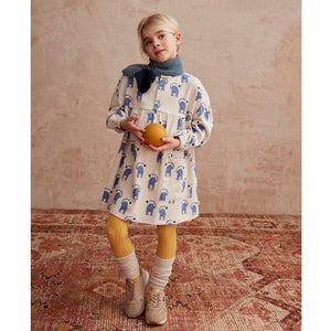 The all-over hand-drawn elephant print adds a sweet and joyful twist, while the brushed interior interlock fabric offers cosy warmth for cooler days. A wide gathered waist, oversized fit, and dropped shoulder puff sleeves with soft elastic cuffs create a relaxed silhouette little ones will love to move in.