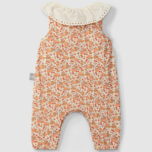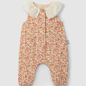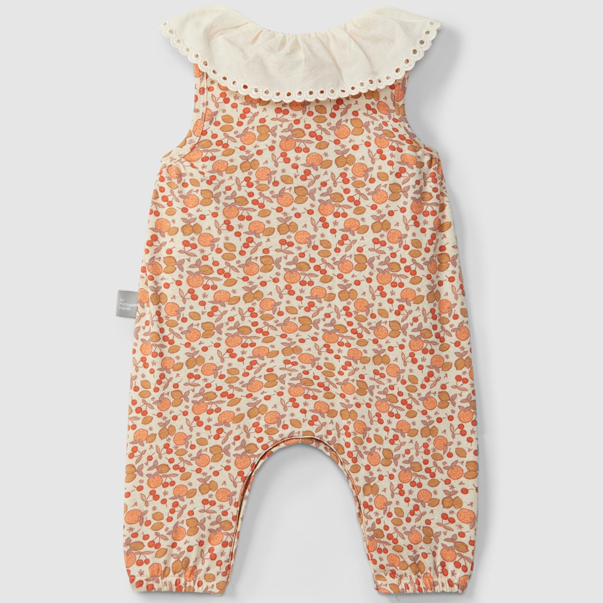 Jumpsuit in printed cotton jersey with linen. Embroidered fabric ruffled collar and functional pockets. Fasten with wooden buttons at the front and poppers between the legs up to 12 months.