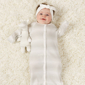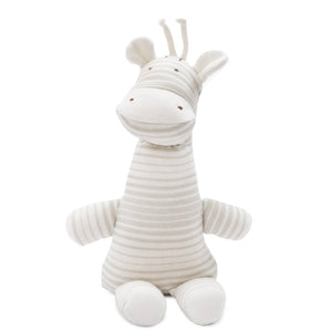 A sweet friend for your baby or toddler, our stuffed giraffe baby toy is a super fun shape that is easy for little hands to hold. This organic baby toy is made of super soft grey striped cotton with a hand embroidered face.