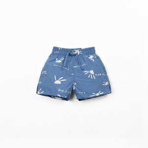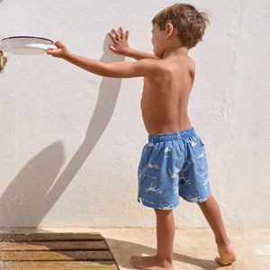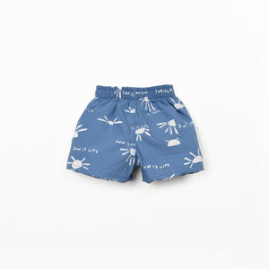 These printed swim shorts are made from organic cotton in Dark Blue color. This model features an elastic waistband and decorative drawstring, includes inner cotton briefs, a back pocket and our sun print.