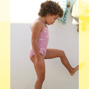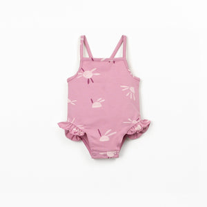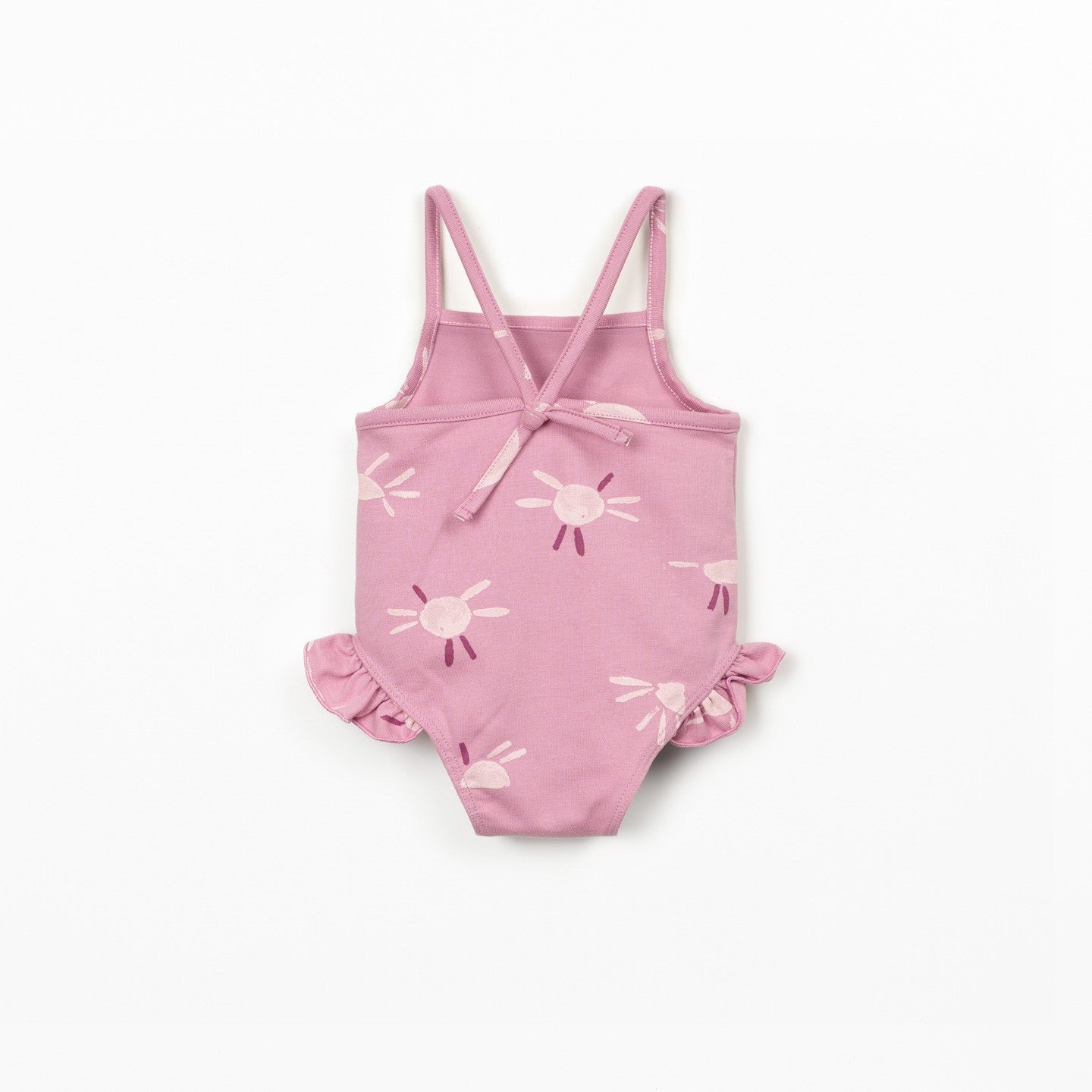 This printed swimsuit is made of organic cotton jersey, in Dark Pink color. It features shoulder straps and a straight neckline, flounce trim at the leg opening, nickel-free metal snap fasteners at the crotch, and sun print.