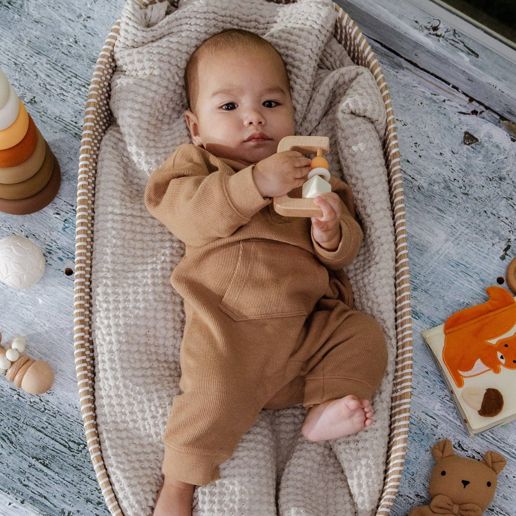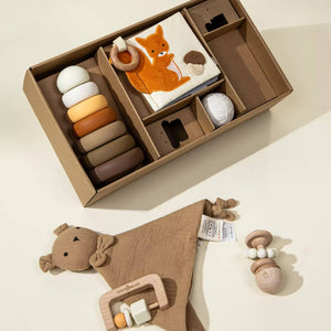 Baby's First Gift Box is a perfect gift that includes: Wooden Rattle: Crafted from smooth, natural wood, this rattle is perfect for little hands to grasp and shake, promoting fine motor skills and auditory development.