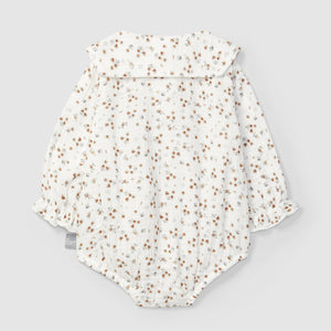 Bodysuit in 100% muslin with floral print. Functional wooden button on the collar. Fastens with hidden poppers at the front and between the legs. Can be used as a bodysuit or romper.