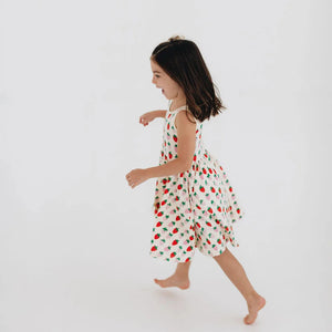 Signature Good Apples dress is made from stretchy-soft organic cotton and designed with a ballet-inspired silhouette. It features a fitted bodice, a graceful scooped back, pockets for all their treasures, and a full circle skirt for endless twirling.
