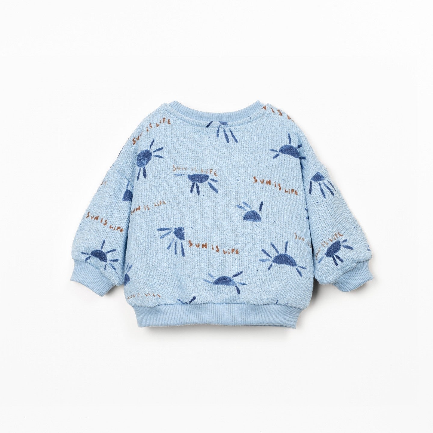This sweatshirt is made from a blend of regenerative cotton and recycled cotton, in Blue. It features the Re(Play) yarn sourced from our post-industrial waste recycling. It is a model with long sleeves, round neckline, ribbed cuffs and waistband, shoulder opening with coconut buttons, and sun print.