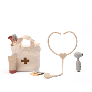 Little ones will love giving their teddies, dolls, and friends a check-up and tending to any ailments with our silicone doctor set. Spark your child's imagination and nurture their caring instincts with this high-quality playset. Made from durable silicone, the pretend play set comes in a convenient cotton tote bag for easy storage and portability.