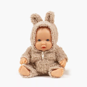Vanilla-scented vinyl doll made in Spain. Fabric clothes developed and manufactured in France.