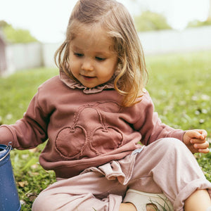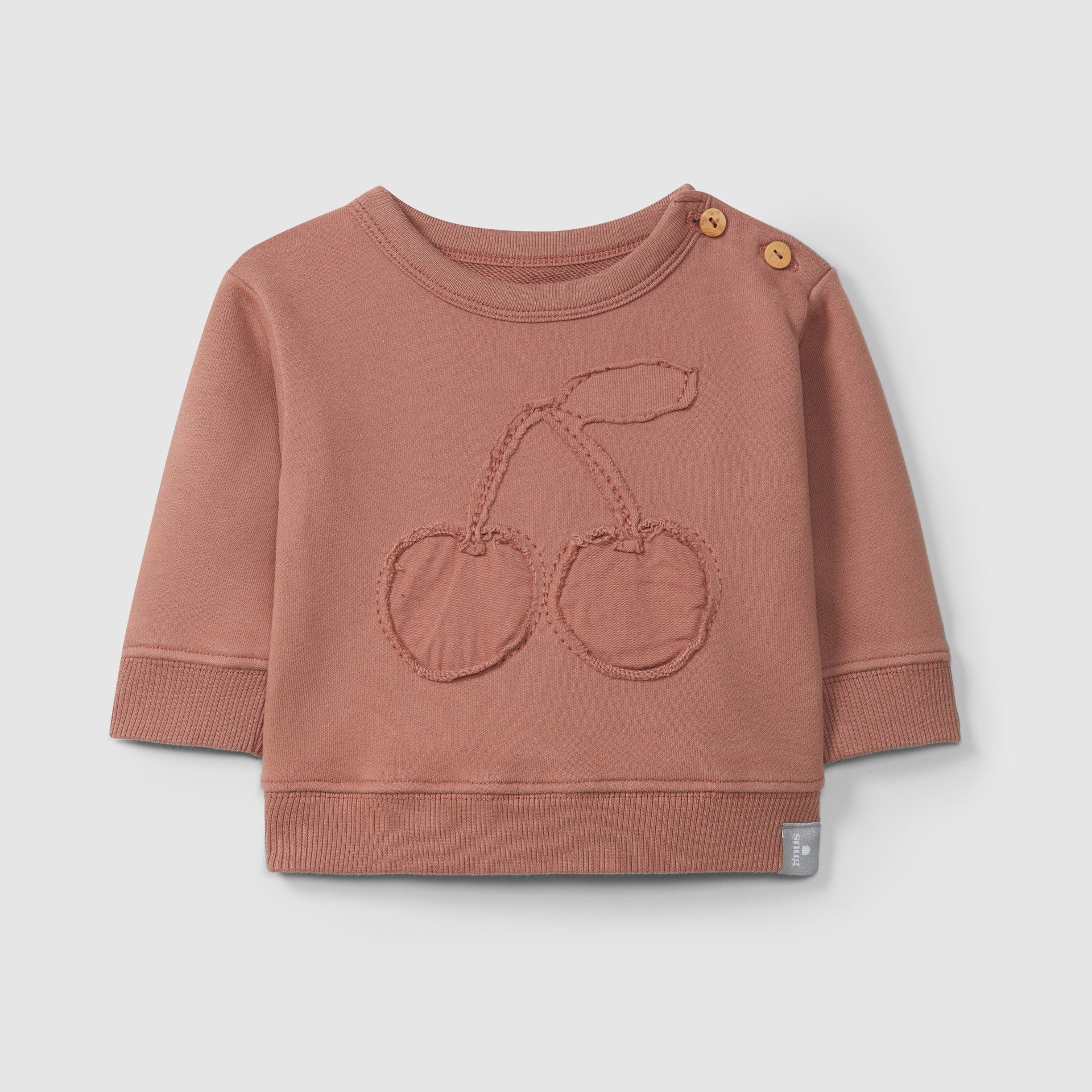 Sweatshirt in 100% organic cotton plush with embroidered appliqué on the front. Fastens with wooden buttons on the shoulder up to 24 months. Ribbed jersey finishes for greater comfort.